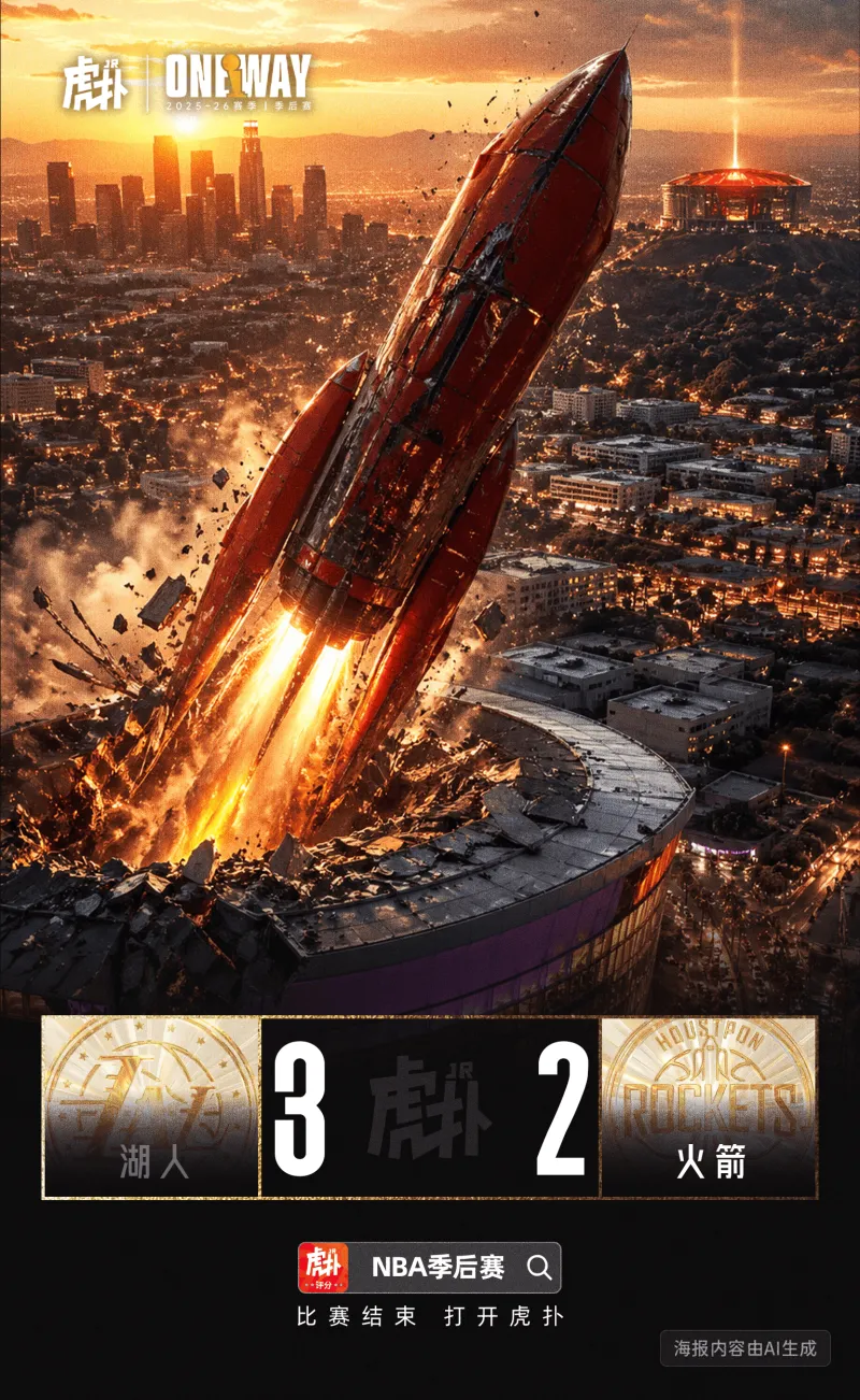 今日AI海报:巨大火箭撞破加密球馆升空逃离,底特律钢拳击打魔术扳回一城